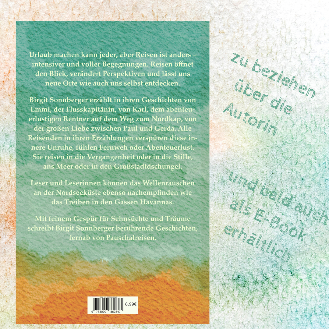 Birgit Sonnberger erzählt in ihren Geschichten von Emmi, der Flusskapitänin, von Karl, dem abenteuerlustigen Rentner auf dem Weg zum Nordkap, von der großen Liebe zwischen Paul und Gerda. Alle Reisenden in ihren Erzählungen verspüren diese innere Unruhe, fühlen Fernweh oder Abenteuerlust. Sie reisen in die Vergangenheit oder in die Stille, ans Meer oder in den Großstadtdschungel.
